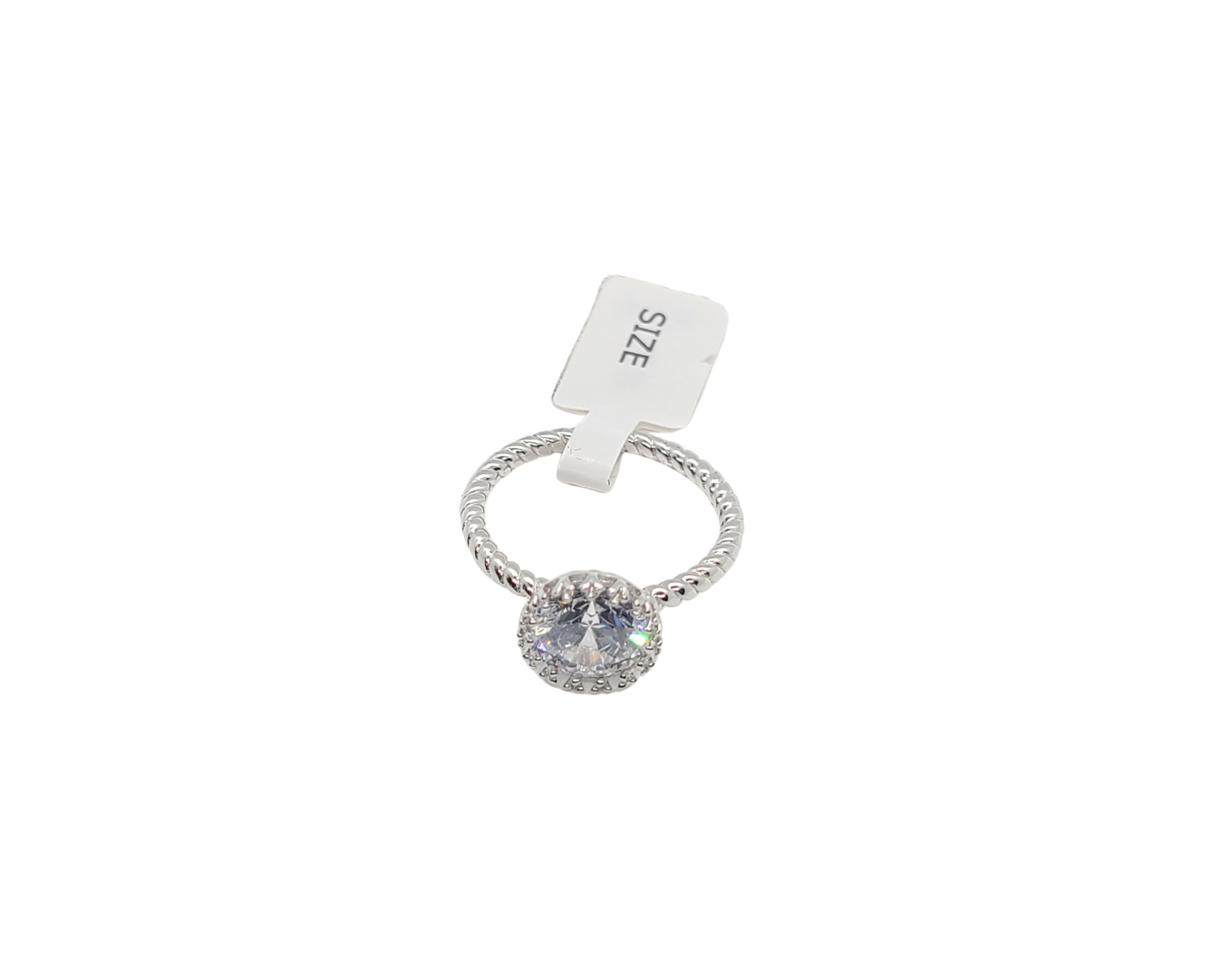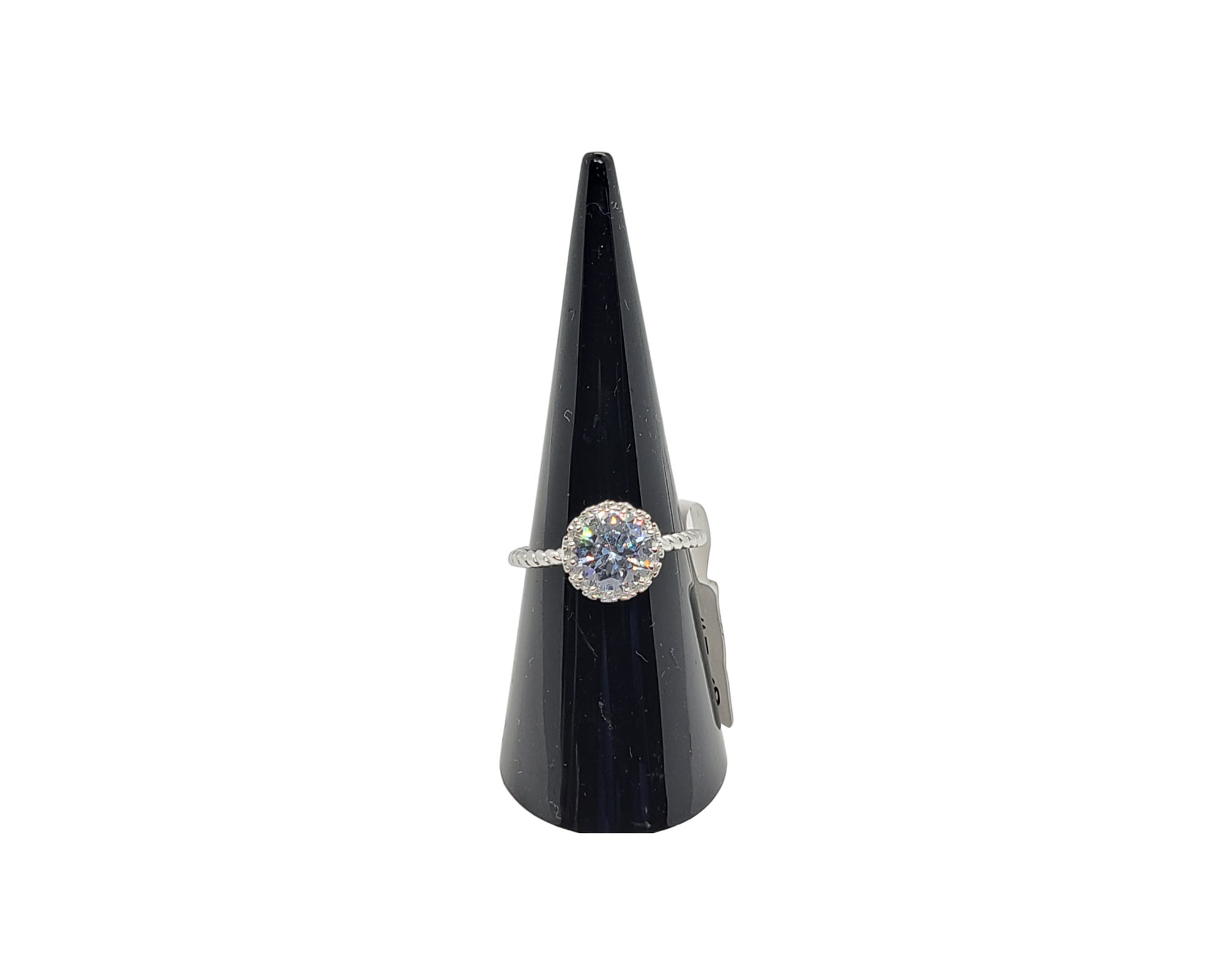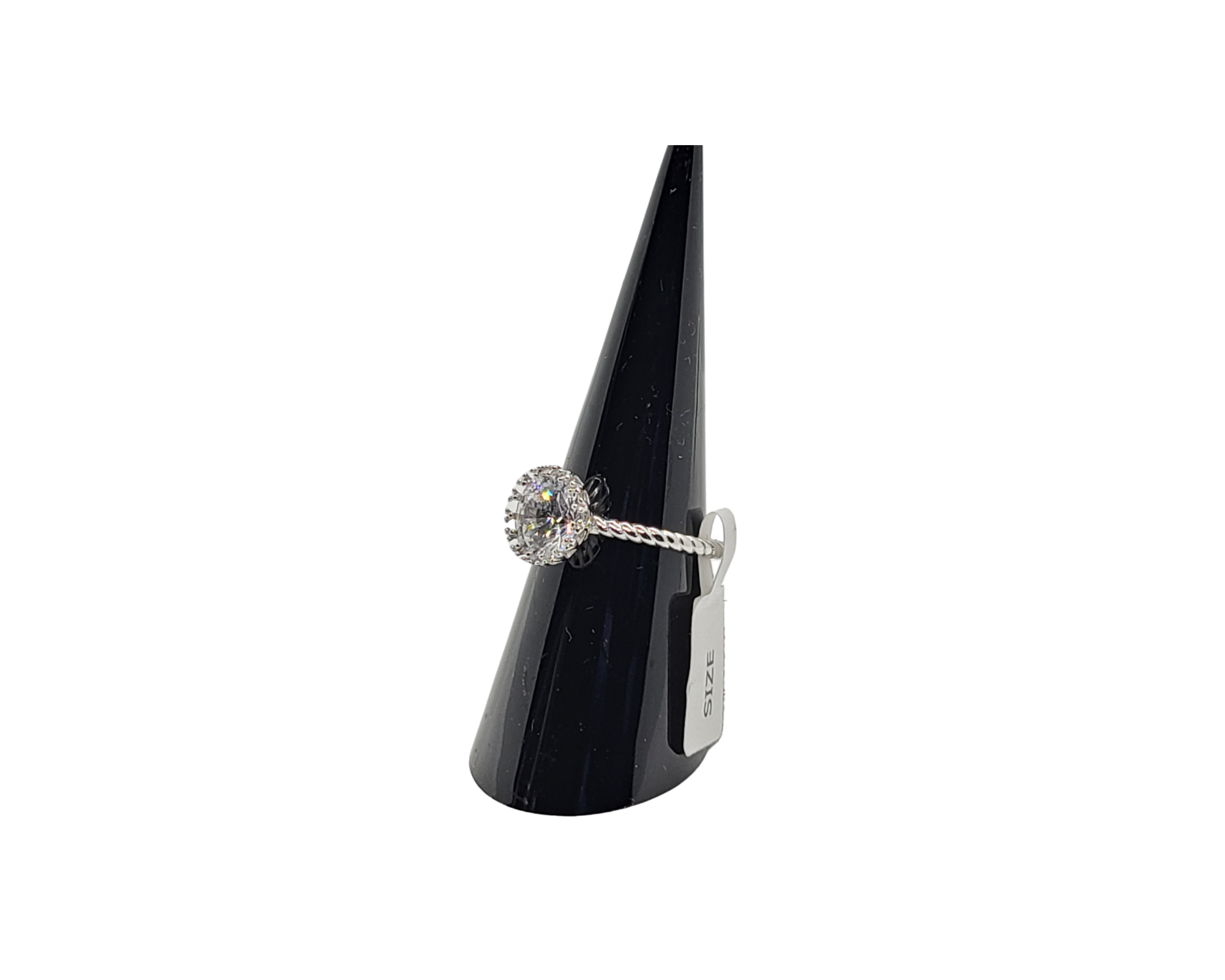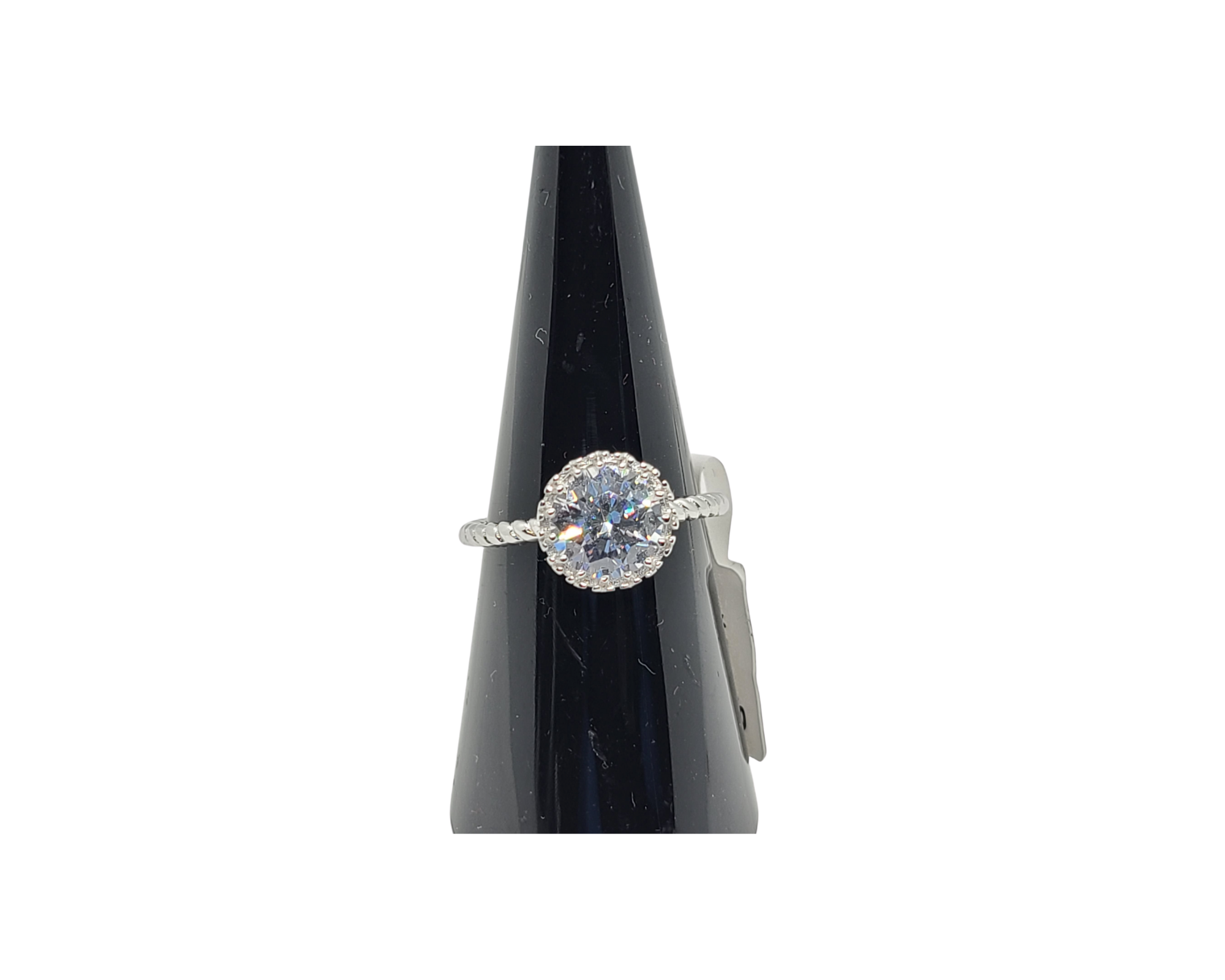 Sterling silver with rhodium, flower ring with 5mm cubic zirconia, 2mm band.