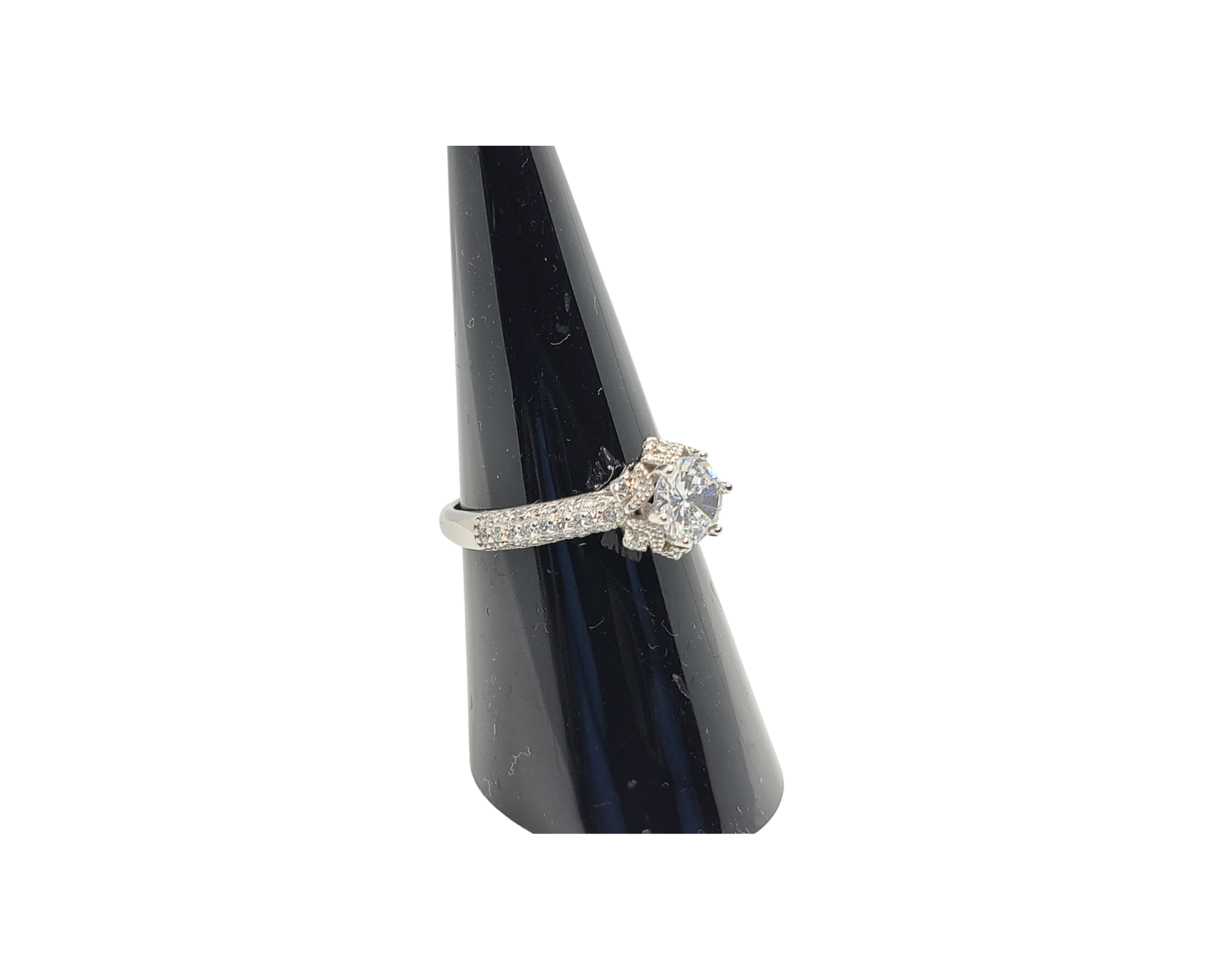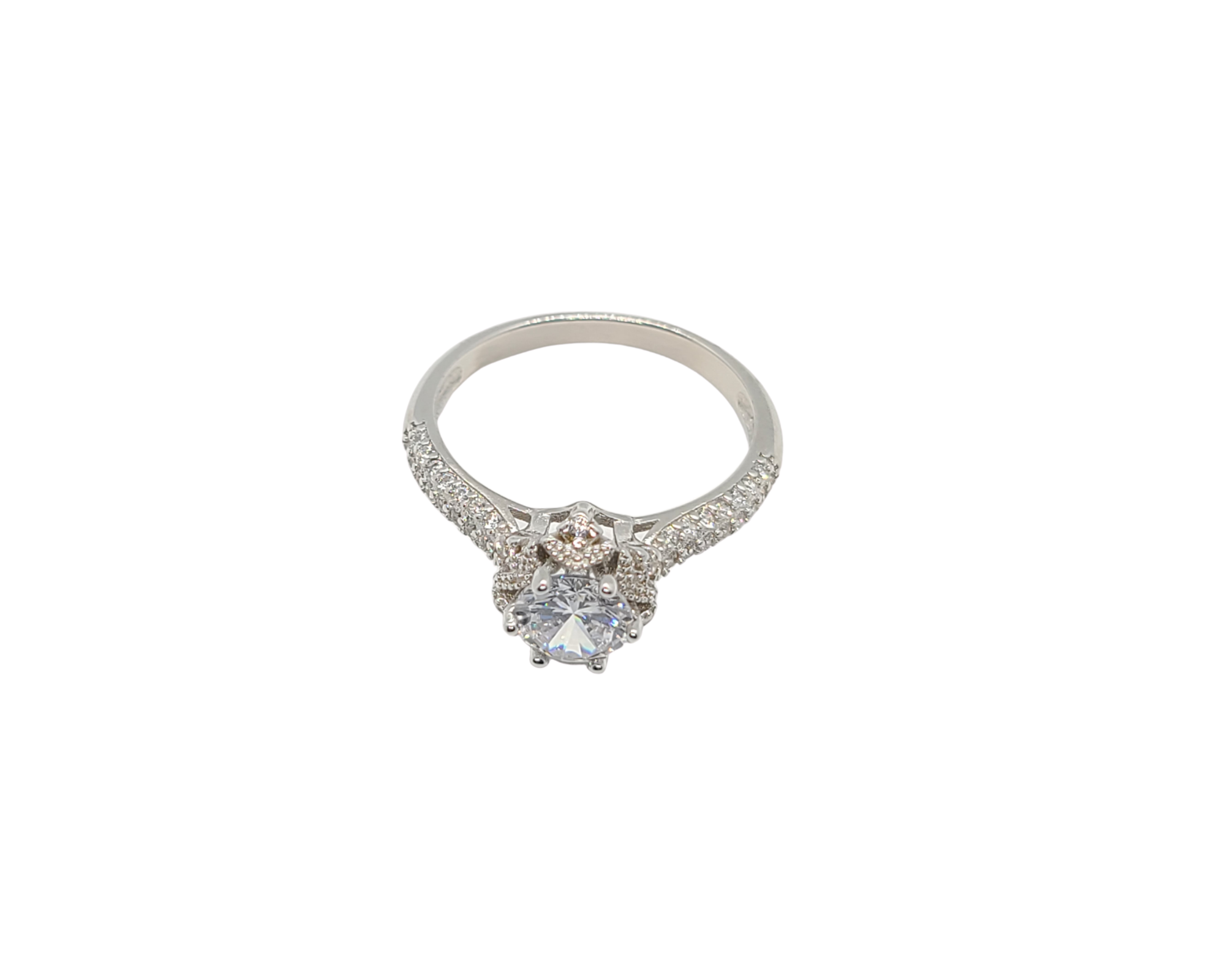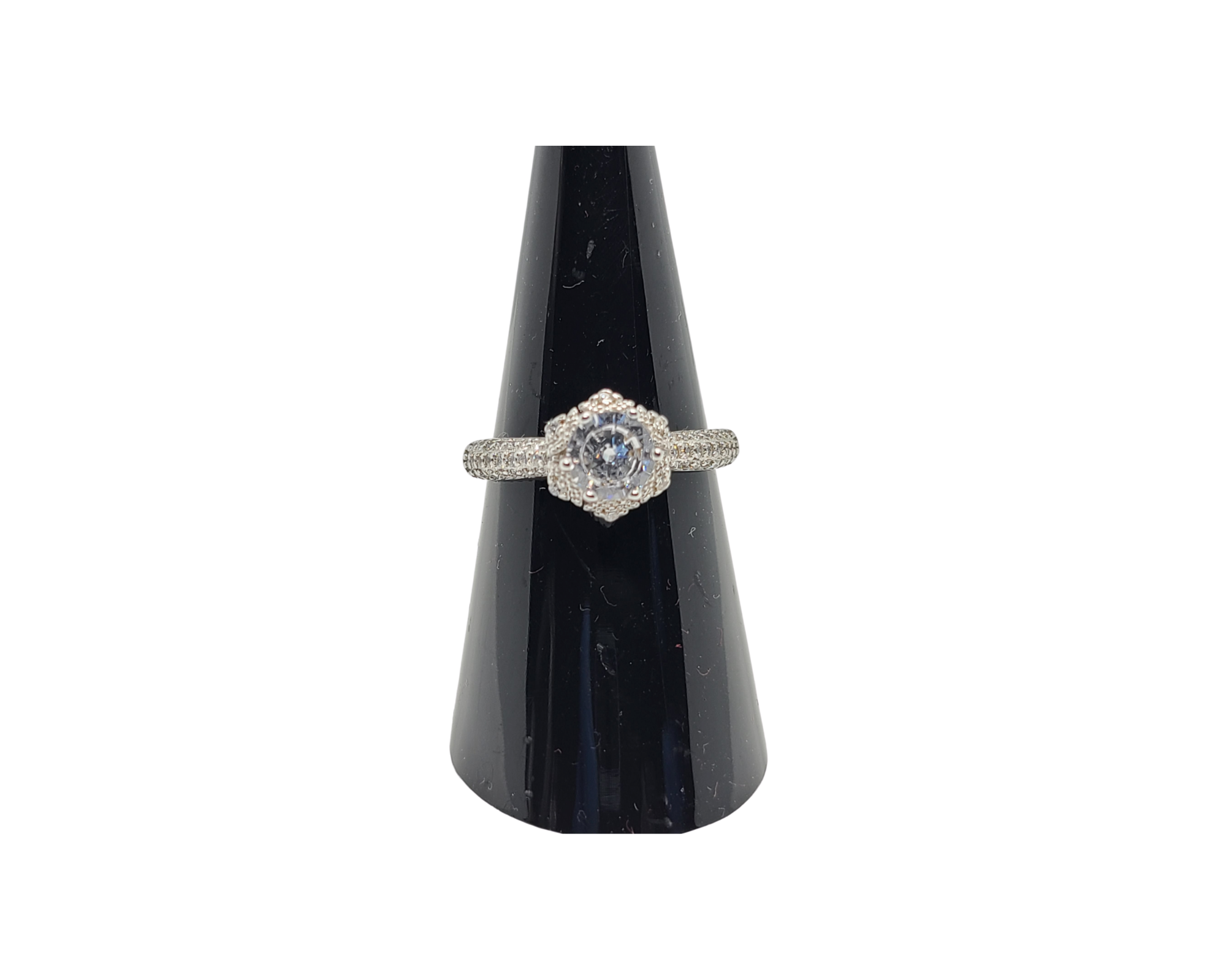 Sterling silver with rhodium round cubic zirconia halo ring.