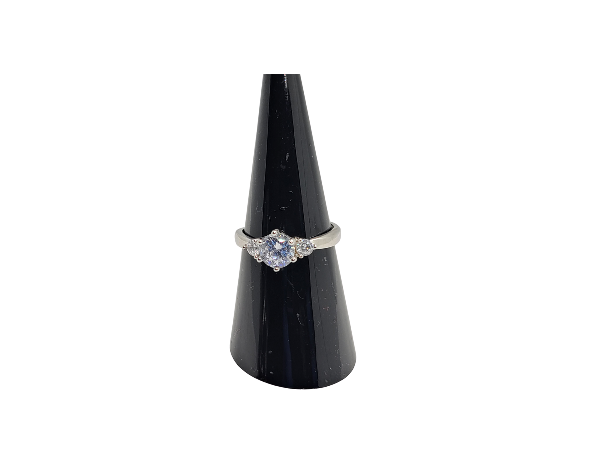 Sterling silver with rhodium, round three cubic zirconia, adjustable halo ring.