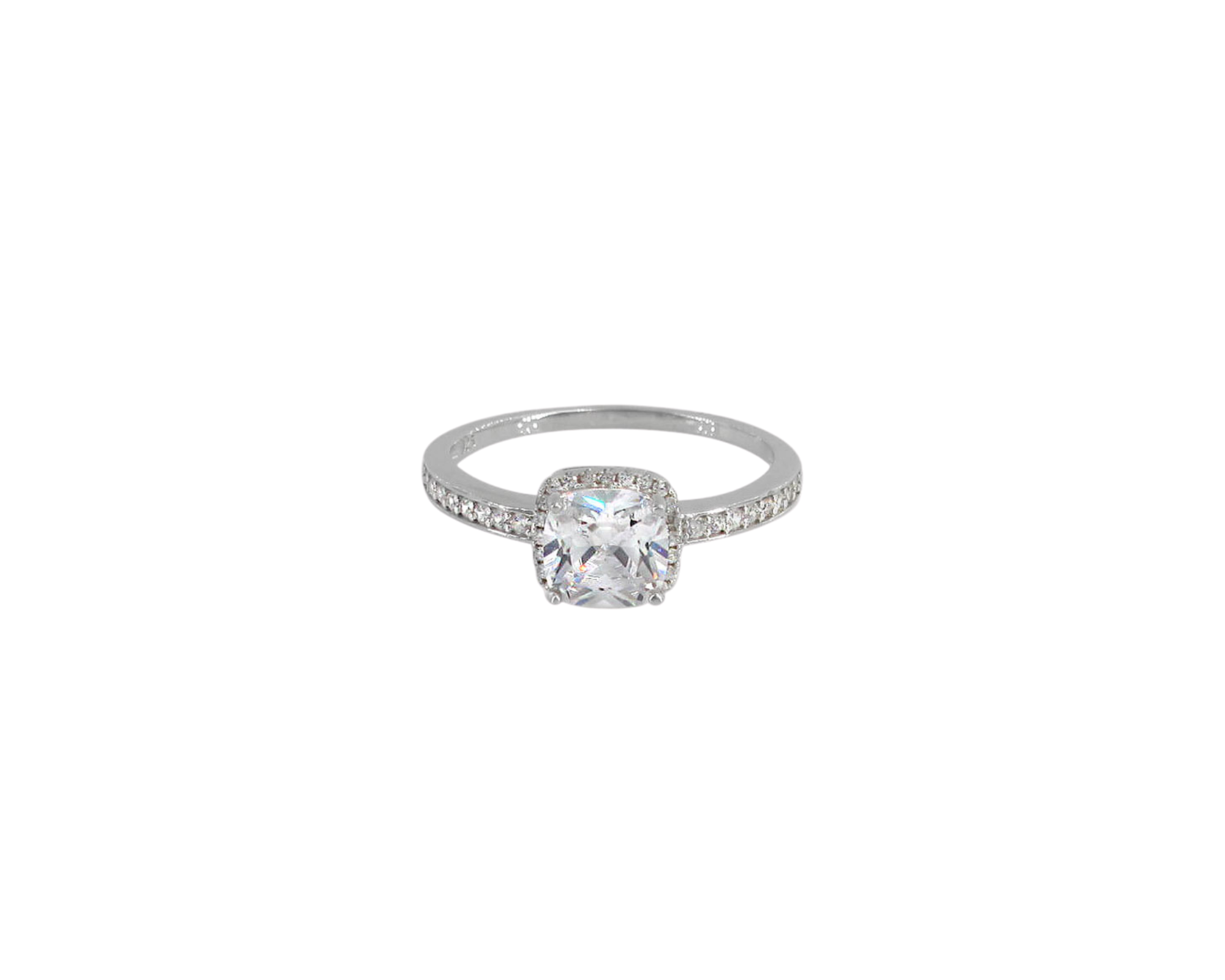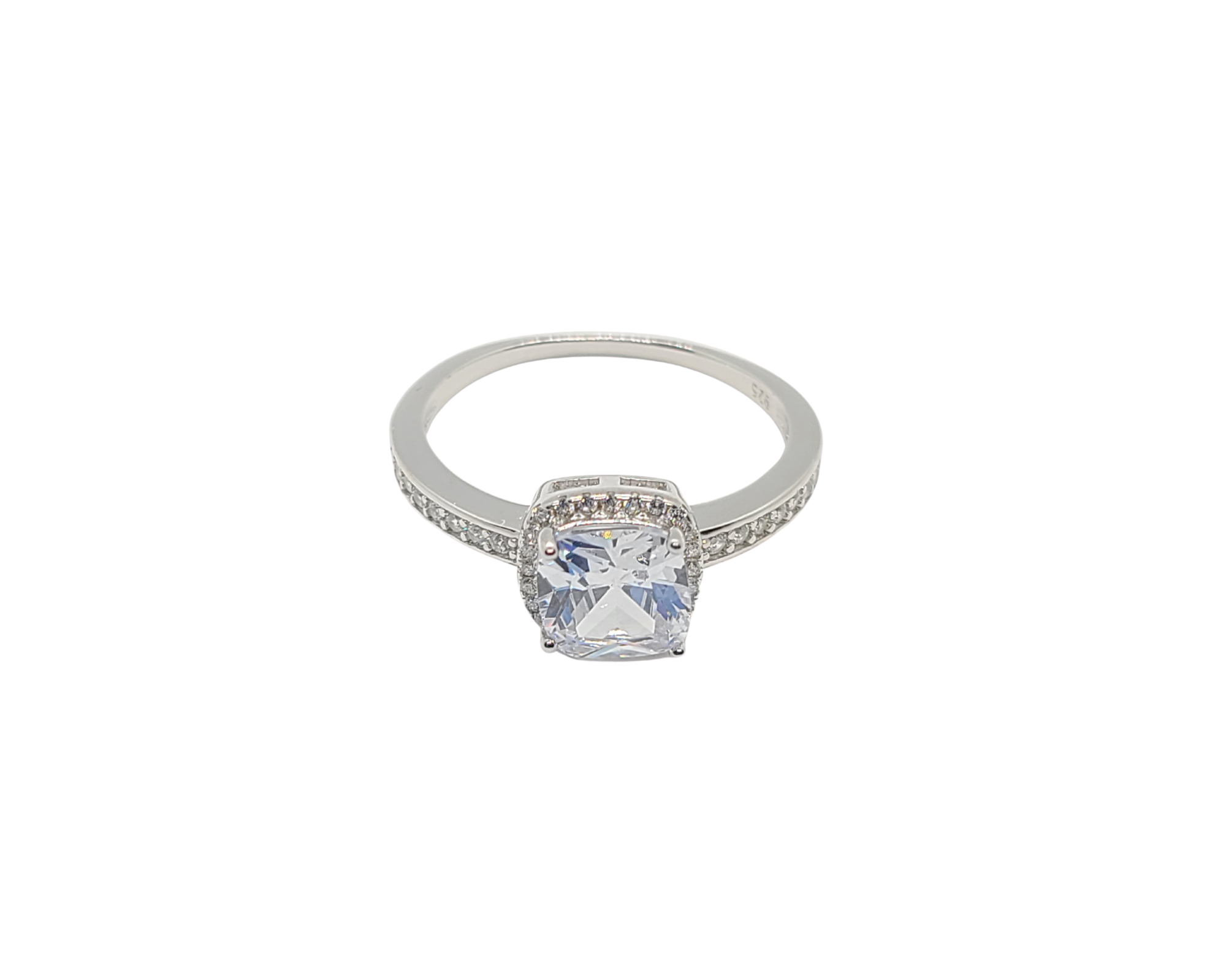 Sterling silver with rhodium, 7x7mm cubic zirconia halo ring, 2mm band.
