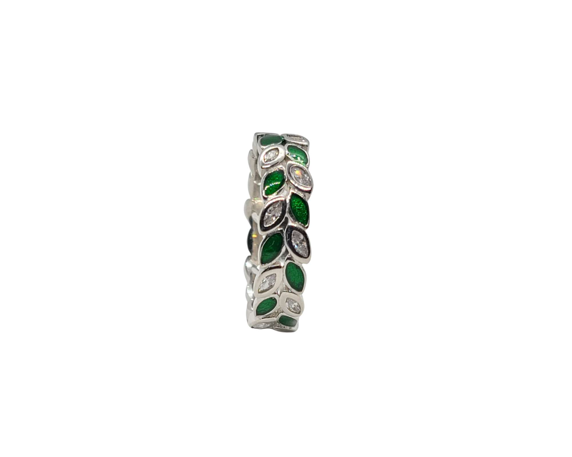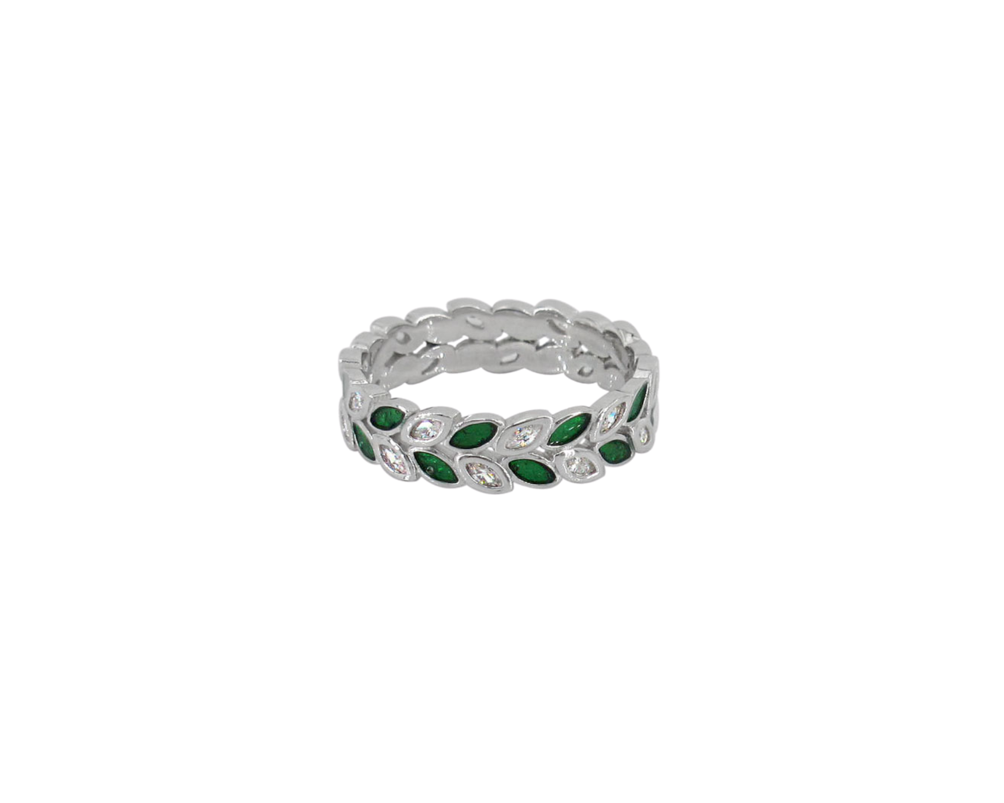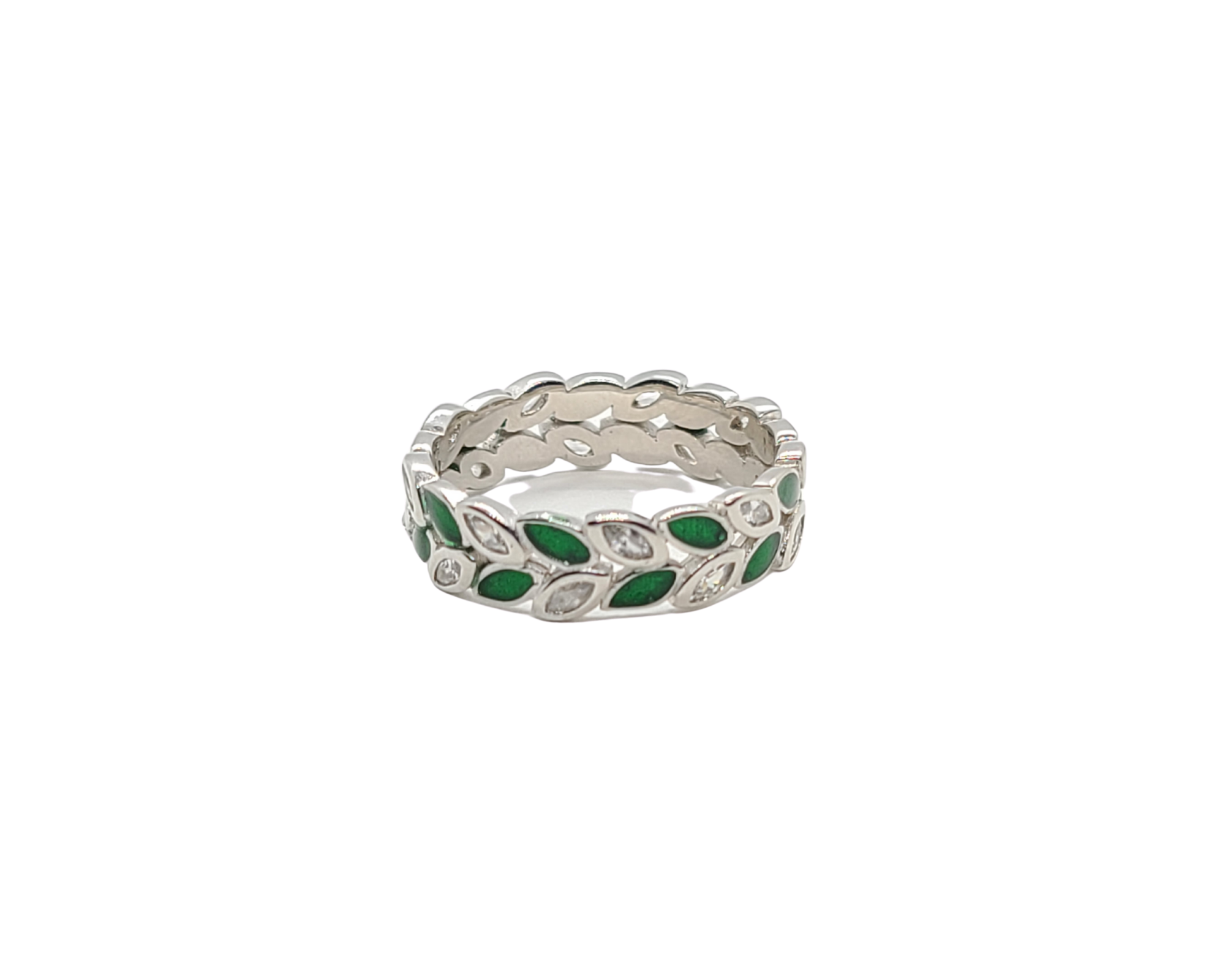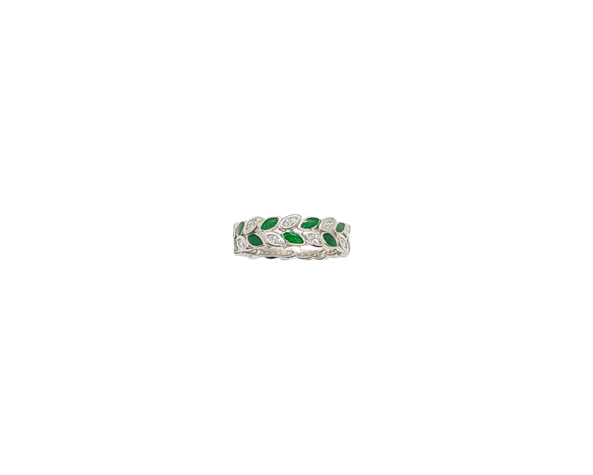Sterling silver with rhodium, vine leaf ring with cubic zirconia, 5.5mm width.