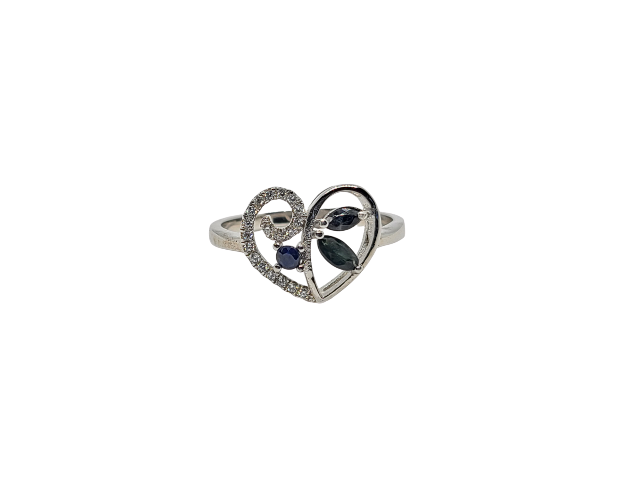 Sterling silver with rhodium, heart ring with sapphire and cubic zirconia.