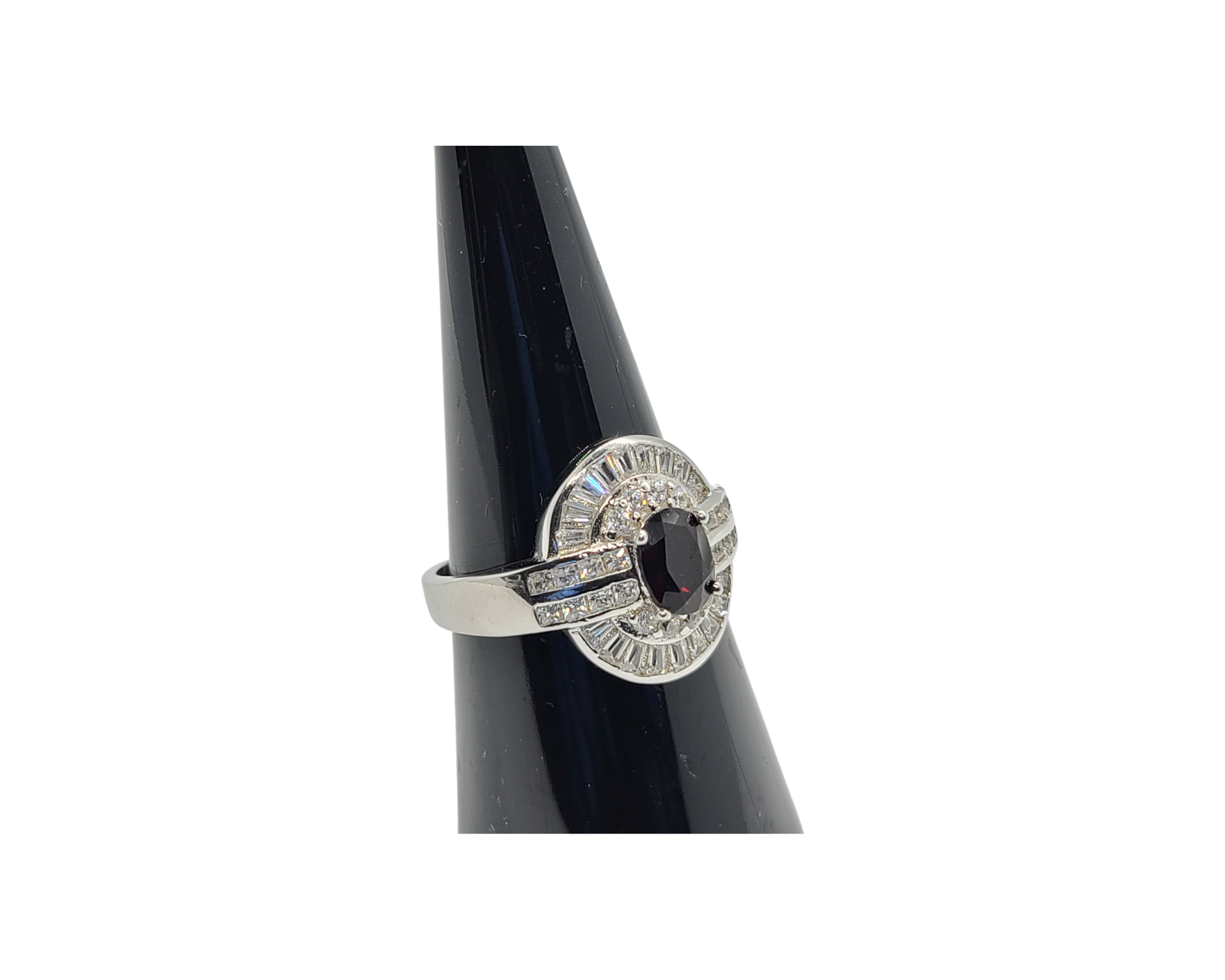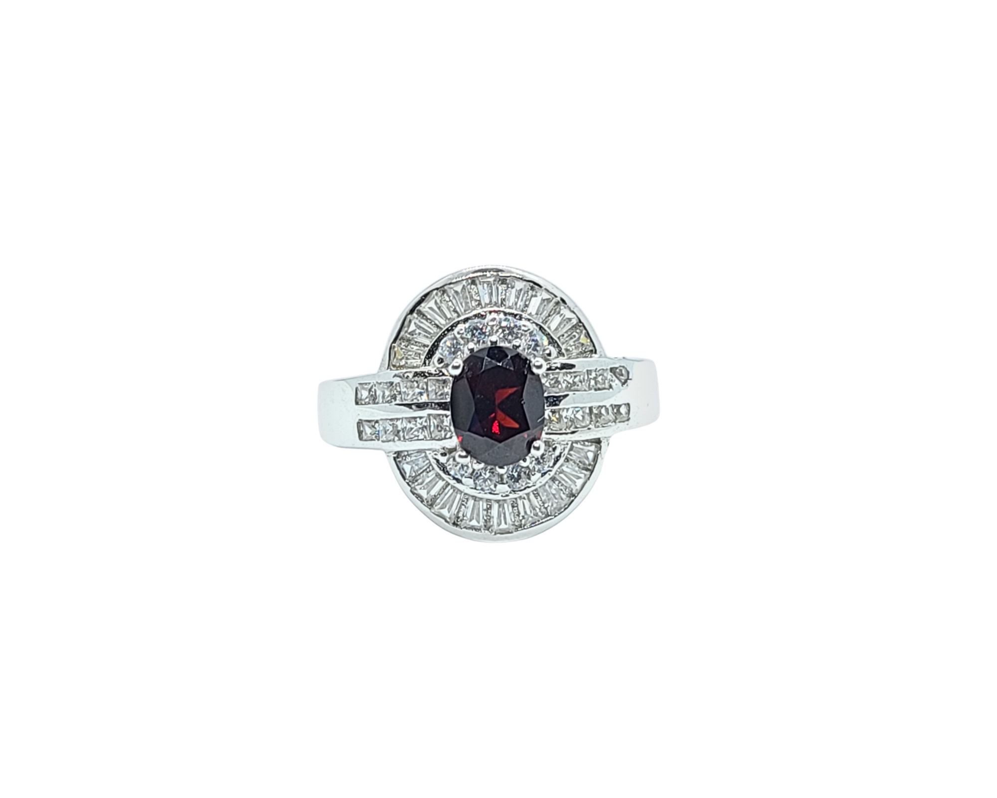 Sterling silver with rhodium, an oval garnet stone ring with cubic zirconia.